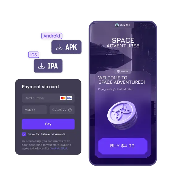 在您自主发行的APK或IPA包中直接内嵌艾克索拉支付,为您的玩家提供无缝的APP内购买体验,实现收益体验双收。